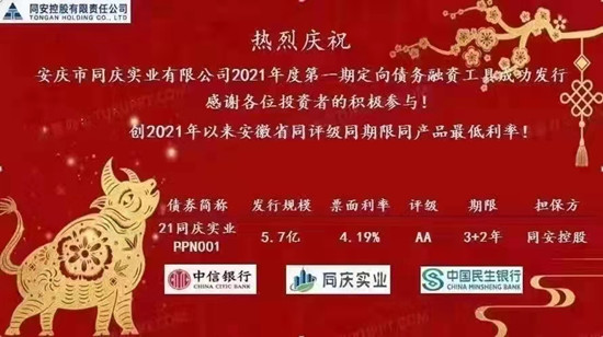 9月3日,同安控股有限責(zé)任公司子公司安慶市同慶實業(yè)有限公司2021年度第一期定向債務(wù)融資工具圓滿發(fā)行成功,首期發(fā)行金額5.7億元,發(fā)行期限3+2年,發(fā)行利率4.19%。