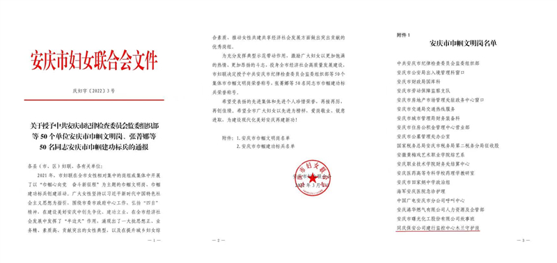 近日,安慶市婦聯(lián)在全市女性相對集中的崗組或集體中開展 的以 “巾幗心向黨 奮斗新征程”為主題的巾幗文明崗創(chuàng)建活動落下帷幕。同慶保安公司建行監(jiān)控中心木蘭守護(hù)崗被授予“安慶市巾幗文明崗”榮譽(yù)稱號。