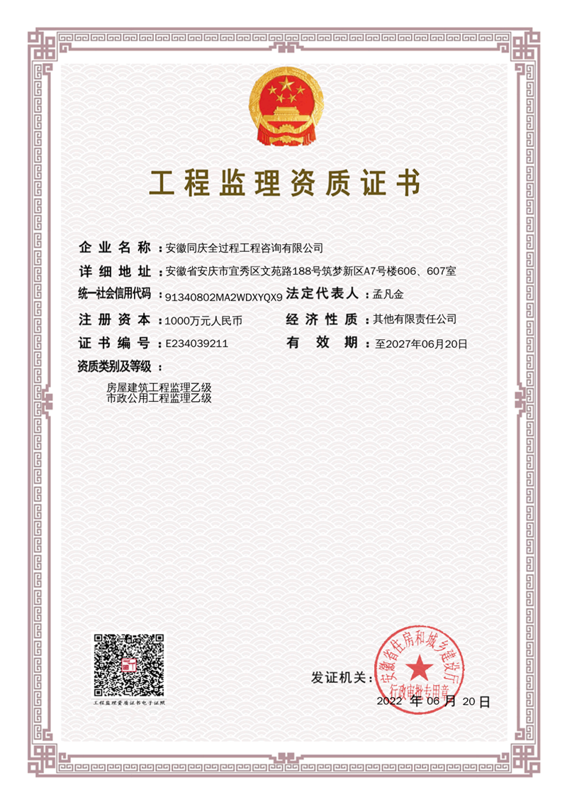 近日,安徽同慶全過程工程咨詢有限公司順利取得了由安徽省住房和城鄉(xiāng)建設(shè)廳頒發(fā)的“房屋建筑工程監(jiān)理乙級(jí)”和“市政公用工程監(jiān)理乙級(jí)”兩項(xiàng)資質(zhì)證書。該資質(zhì)的成功獲取,標(biāo)志著公司資質(zhì)申辦工作取得重大突破,對(duì)公司拓寬咨詢業(yè)務(wù)范圍,提升企業(yè)競(jìng)爭(zhēng)力具有十分重要的意義。