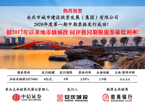 2020年4月28日,同安控股子公司——安慶市城投公司成功發(fā)行2020年中期票據(jù)(第一期),發(fā)行規(guī)模8億元,發(fā)行期限5年,票面利率3.95%,創(chuàng)2017年以來全國地市級城投公司同評級、同期限債券最低利率,同時也創(chuàng)2017年以來安徽省所有AA級公司5年期債券最低票面利率。