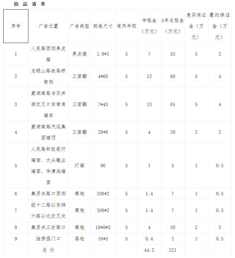 特別提示:1、6、7、8、9號標(biāo)的屬公共載體不含場地租金;4號標(biāo)的含場地租金,場地租金為成交價的40%,由委托方支付給場地產(chǎn)權(quán)人;2、3、5不含場地租金,成交后由競得人自行與產(chǎn)權(quán)人協(xié)商場地租金等相關(guān)事宜。