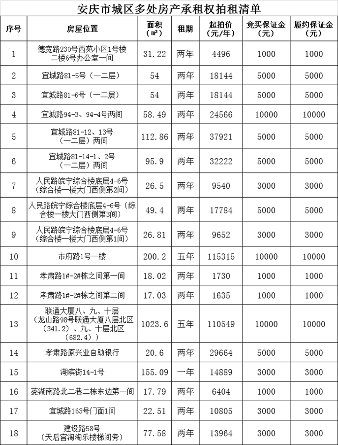 一、標(biāo)的(以現(xiàn)狀拍租):安慶同安資產(chǎn)運(yùn)營(yíng)有限公司名下安慶市城區(qū)多處房產(chǎn)承租權(quán),具體位置、面積、起始價(jià)、保證金等詳見拍租清單。